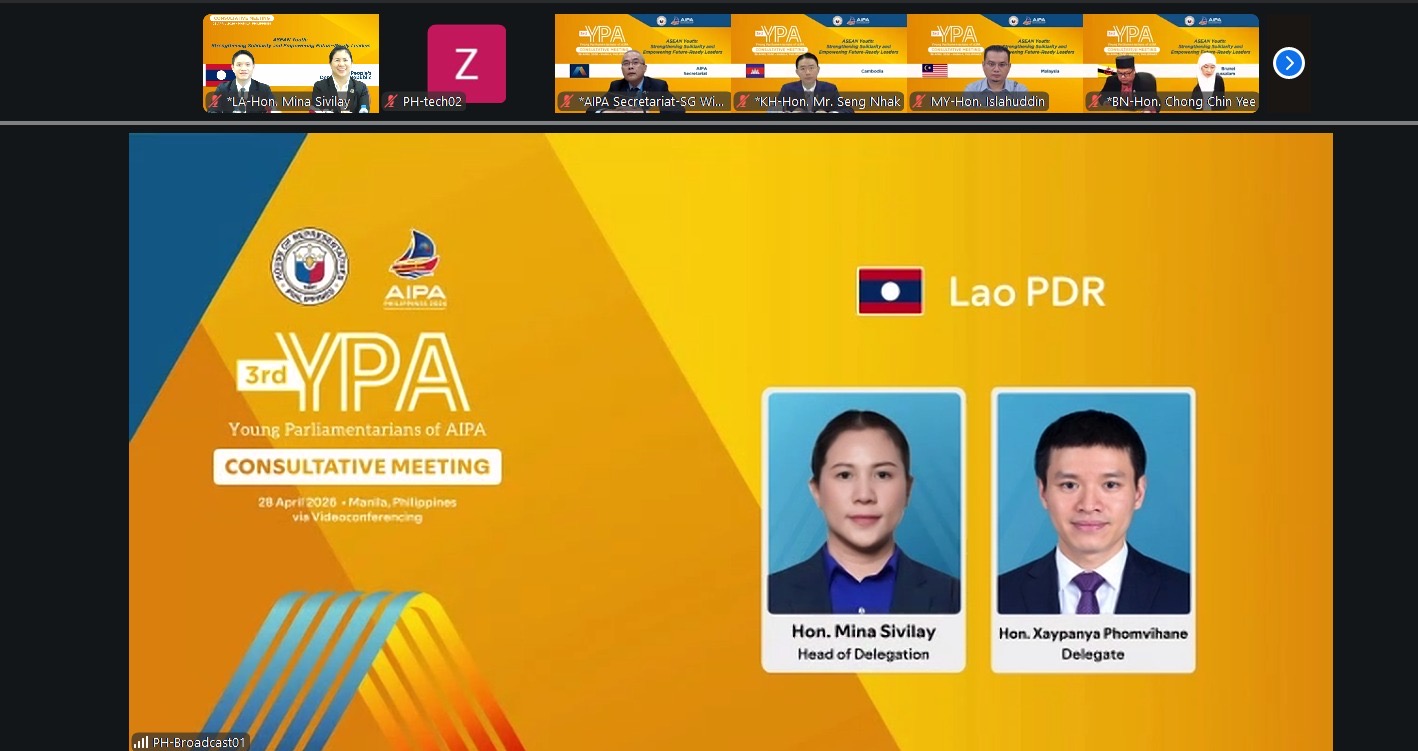 (ສພຊ) – ວັນທີ 28 ເມສາ 2026, ຄະນະຜູ້ແທນສະພາແຫ່ງຊາດ ນຳໂດຍທ່ານ ນາງ ມີນາ ສີວິໄລ ສະມາຊິກສະພາແຫ່ງຊາດ (ສສຊ), ຮອງເລຂາຄະນະບໍລິຫານງານສູນກາງຊາວໜຸ່ມປະຊາຊົນປະຕິວັດລາວ ແລະ ທ່ານ ໄຊປັນຍາ ພົມວິຫານ ສະ ມາຊິກສະພາແຫ່ງຊາດ ປະຈຳກຳມາທິການການຕ່າງປະເທດ ໄດ້ເຂົ້າຮ່ວມກອງປະຊຸມປຶກສາຫາລືຂອງສະມາຊິກລັດຖະສະພາໜຸ່ມຂອງສະມັດຊາລັດຖະສະພາລະຫວ່າງຊາດອາຊຽນ (YPA) ຄັ້ງທີ 3 ໃນຮູບແບບທາງໄກ ເຊິ່ງເປັນເຈົ້າພາບຈັດຂຶ້ນໂດຍສະ ພາຜູ້ແທນປະຊາຊົນ ແຫ່ງສາທາລະນະລັດຟິລິບປິນ, ມີຄະນະຜູ້ແທນທີ່ເປັນສະມາຊິກລັດຖະສະພາໜຸ່ມຈາກສະມາຊິກສະ ມັດຊາລັດຖະສະພາລະຫວ່າງຊາດອາຊຽນ ຫຼື ໄອປາ (AIPA), ກອງເລຂາ AIPA ແລະ ຊ່ຽວຊານທີ່ກ່ຽວຂ້ອງ ເຂົ້າຮ່ວມ 48 ທ່ານ; ໃນພິທີເປີດກອງປະຊຸມ, ໄດ້ຮັບກຽດກ່າວຕ້ອນຮັບໂດຍທ່ານ ນາງ ມາເຣຍ ຣາເຊວ “ເບບີ” ຈິມີເນຊ ອາເຣນາສ (Maria Rachel “Baby” Jimenez Arenas) ຮອງປະທານສະພາຜູ້ແທນປະຊາຊົນຟິລິບປິນ ແລະ ກ່າວເປີດກອງປະຊຸມຢ່າງເປັນທາງການໂດຍທ່ານ ເຟົາສຕິໂນ “ໂບຈີ” ເດີ ກຸຊມານ ດີ ທີ III (Faustino “Bojie” De Guzman Dy III) ປະທານສະພາຜູ້ແທນປະຊາຊົນຟິລິບປິນ ທັງເປັນປະທານ AIPA ຄັ້ງທີ 47.
