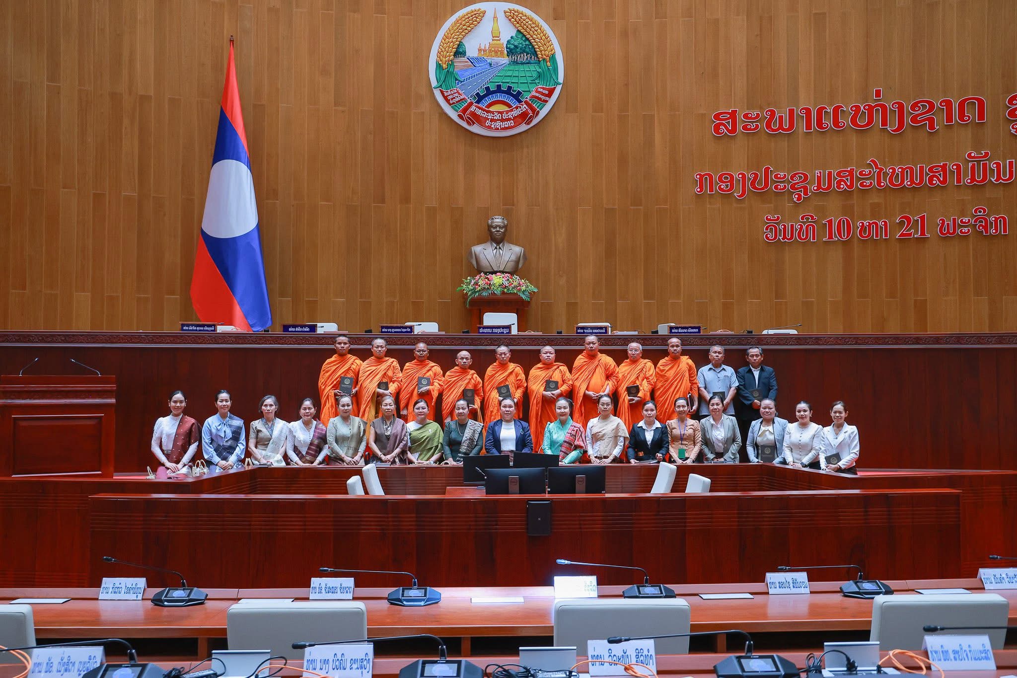 (ສພຊ) – ຕອນບ່າຍວັນທີ 24 ພະຈິກ 2025 , ກົມສື່ມວນຊົນ ຮ່ວມກັບຫ້ອງການຄຸ້ມຄອງຫໍສະພາແຫ່ງຊາດ (ສພຊ) ໄດ້ຕ້ອນຮັບ ພຣະອາຈານ ສີທົນ ໄຊຍະວົງສອນ ຄະນະບໍລິຫານງານປະຈຳສູນກາງອົງການພຸດທະສາສະໜາສັມພັນລາວ (ອພສ), ຫົວໜ້າກັມມາທິການເຜີຍແຜ່ສິລະທັມ ແລະ ປະຕິບັດກັມມະຖານ ສູນກາງ ອພສ, ຮອງປະທານມູນນິທິພຸດທະບັນດິດ, ຮອງປະທານສະມາຄົມອະນຸລັກຢາພື້ນເມືອງລາວ, ທີ່ປຶກສາ ອພສ ເມືອງນາຊາຍທອງ ນະຄອນຫຼວງວຽງຈັນ, ເຈົ້າອາທິການວັດປ່ານາຄູນນ້ອຍ ພ້ອມດ້ວຍຄະນະພະສົງ ແລະ ສິດສານຸສິດ ທີ່ມາທັດສະນະສຶກສາຢ້ຽມຊົມຫ້ອງມູນເຊື້ອ, ຫ້ອງປະຊຸມໃຫຍ່ ແລະ ງານວາງສະແດງສະພາແຫ່ງຊາດ ຄົບຮອບ 50 ປີ (2/12/1975 – 2/12/2025).