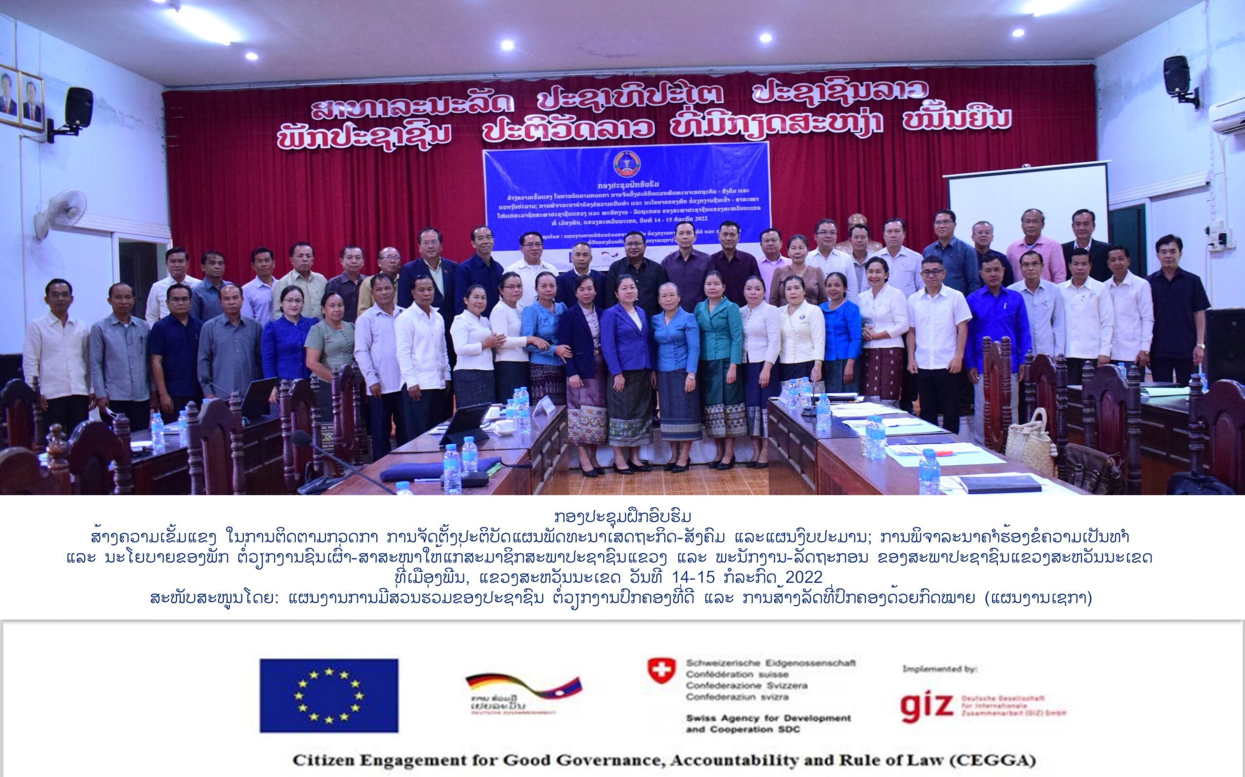 ຮັບ​ຜົນສຳ​ເລັດ​ຕາມ​ຈຸດປະສົງ​ ແລະ ລະດັບ ຄາດໝາຍ ທີ່ວາງໄວ້. ກອງປະຊຸມຝຶກອົບຮົມໃນຄັ້ງນີ້ ແມ່ນໄດ້ຮັບການສະໜັບສະໜູນໂດຍ: ຈາກແຜນງານການມີສ່ວນຮ່ວມຂອງປະຊາຊົນ ຕໍ່ວຽກງານການປົກຄອງທີ່ດີ ແລະ ການສ້າງລັດ ທີ່ປົກຄອງດ້ວຍກົດໝາຍ ( ແຜນງານເຊກາ-CEGGA ).