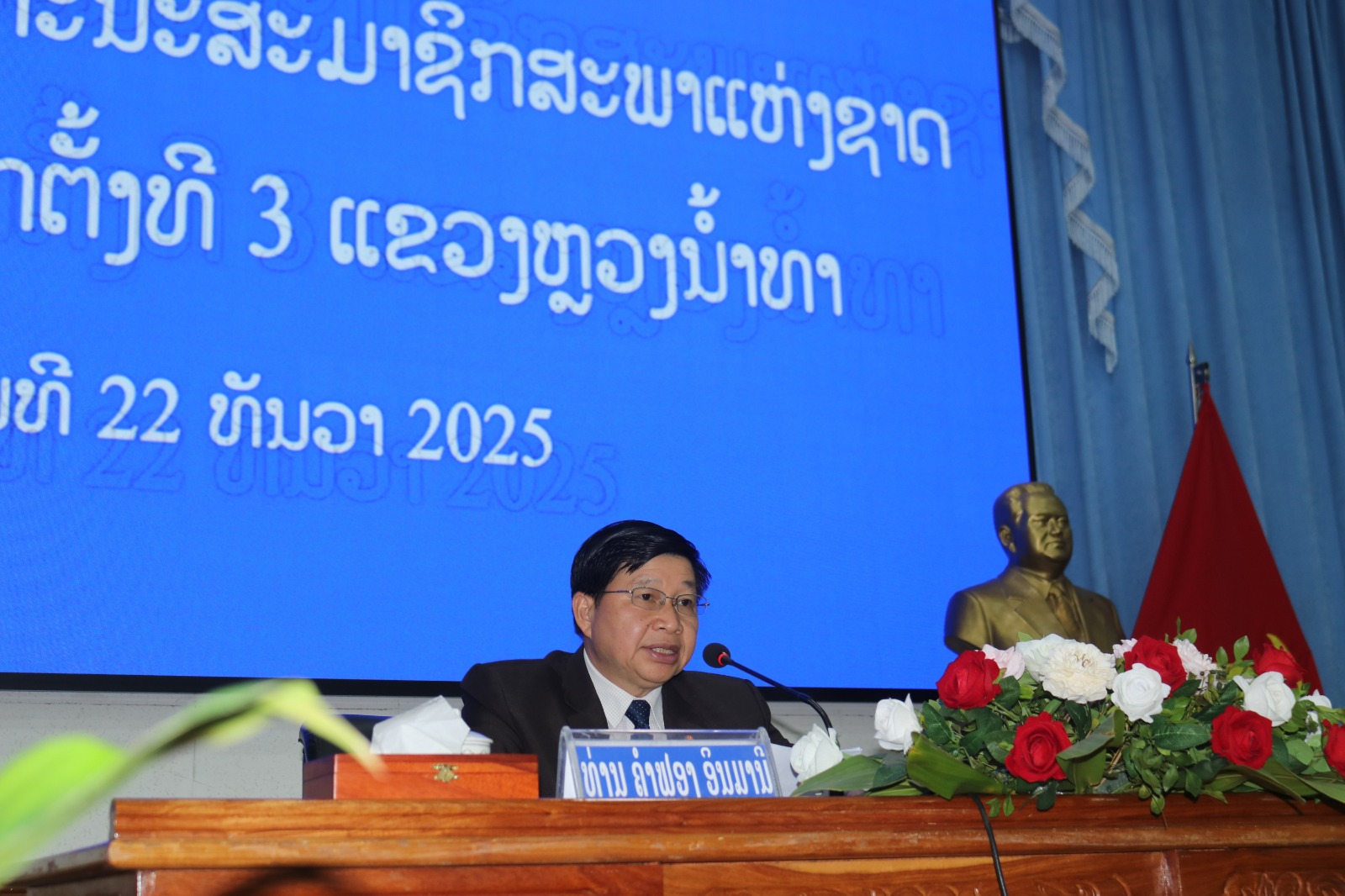 ຕອນບ່າຍວັນທີ 22 ທັນວາ 2025 ຄະນະສະມາຊິກສະພາແຫ່ງຊາດປະຈໍາເຂດເລືອກຕັ້ງທີ3 ແຂວງຫຼວງນໍ້າທາ ໄດ້ໄຂກອງປະຊຸມປະຈຳປີ 2025 ຂຶ້ນທີ່ສະໂມສອນຂອງແຂວງ ໂດຍການເປັນປະທານຂອງ ທ່ານ ຄໍາຟອງ ອິນມານີ ຮອງເລຂາຄະນະບໍລິຫານງານພັກແຂວງ ປະທານສະພາປະຊາຊົນແຂວງຫຼວງນໍ້າທາ, ໃຫ້ກຽດເຂົ້າຮ່ວມໂດຍ ທ່ານ ພົຕ ປອ ວົງສັກ ພັນທະວົງ ຄະນະປະຈຳສະພາແຫ່ງຊາດ ສະມາຊິກສະພາແຫ່ງຊາດ ປະຈຳເຂດເລືອກຕັ້ງ, ມີບັນດາທ່ານ ຄະນະປະຈຳພັກແຂວງ, ສະມາຊິກສະພາແຫ່ງຊາດປະຈຳເຂດເລືອກຕັ້ງ, ສະມາຊິກສະພາປະຊາຊົນແຂວງ, ອາດີດສະມາຊິກສະພາແຫ່ງຊາດປະຈໍາເຂດເລືອກຕັ້ງທີ3 ພ້ອມດ້ວຍພາກສ່ວນທີາກ່ຽວຂ້ອງເຂົ້າຮ່ວມທັງໝົດ 70 ກວ່າທ່ານ.
