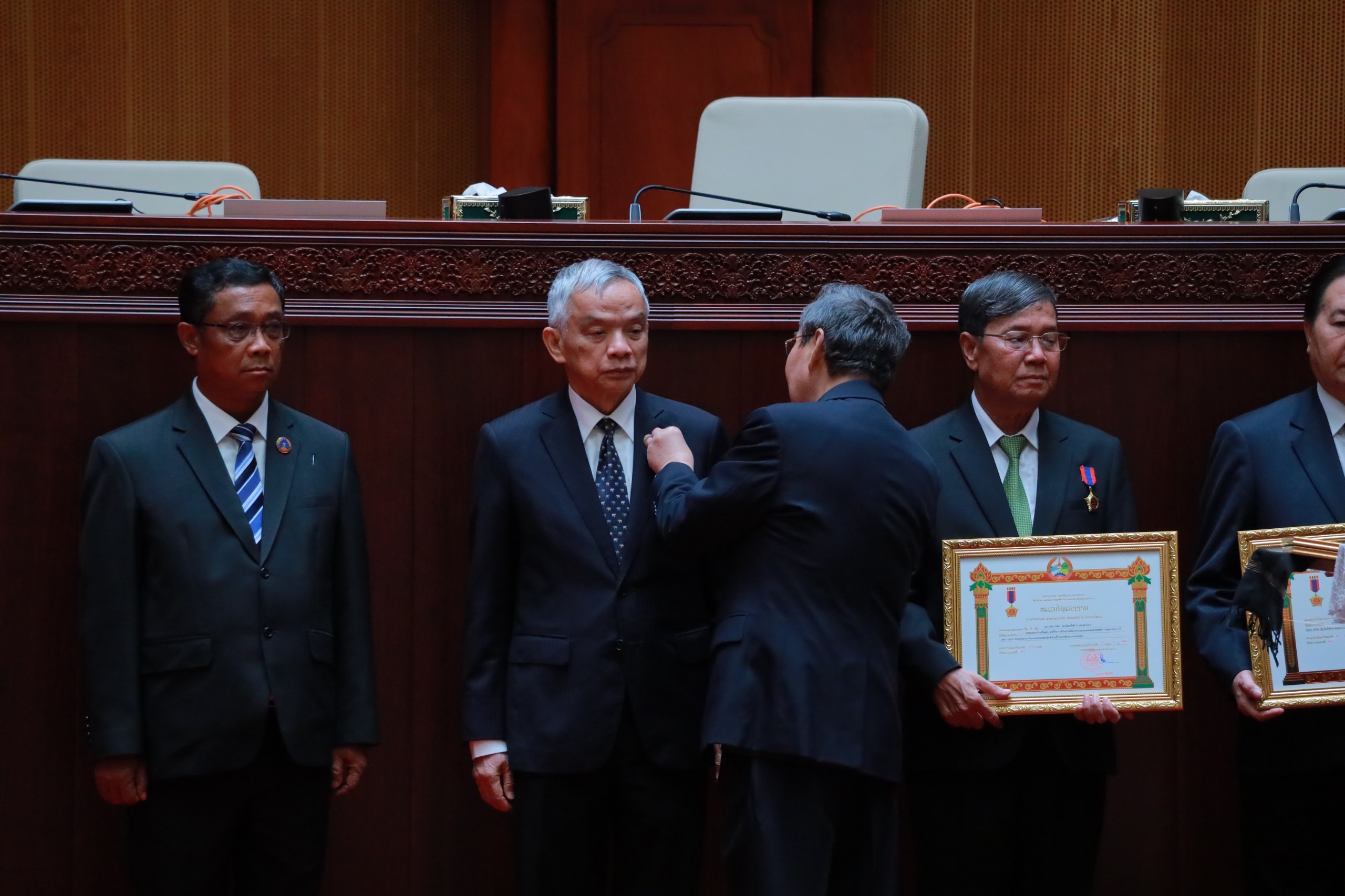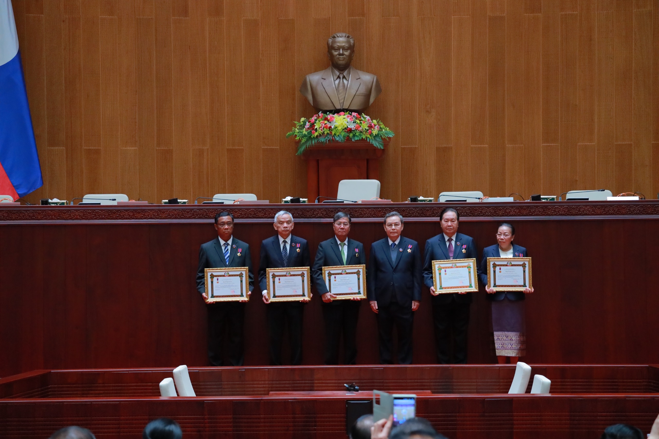 ຈາກນັ້ນ, ທ່ານ ປອ. ໄຊສົມພອນ ພົມວິຫານ ກຳມະການກົມການເມືອງສູນກາງພັກ, ປະທານສະພາແຫ່ງຊາດ ໄດ້ປະດັບຫຼຽນກາລະນຶກ 50 ປີ ວັນສ້າງຕັ້ງສະພາແຫ່ງຊາດ ໃຫ້ແກ່ບັນດາທ່ານຄະນະປະຈໍາສະພາແຫ່ງຊາດ ຊຸດທີ VIII; ທ່ານ ປອ. ນາງ ສູນທອນ ໄຊຍະຈັກ ເລຂາທິການສູນກາງພັກ, ຮອງປະທານສະພາແຫ່ງຊາດ ປະດັບຫຼຽນກາລະນຶກ 50 ປີ ວັນສ້າງຕັ້ງສະພາແຫ່ງຊາດ ແລະ ຫຼຽນກາລະນຶກ 5 ປີ ສະພາແຫ່ງຊາດ ຊຸດທີ IX ໃຫ້ແກ່ທ່ານປະທານສະພາແຫ່ງຊາດ ແລະ ປະດັບໃຫ້ແກ່ ສສຊ ນັບແຕ່ເຂດເລືອກຕັ້ງທີ 1-18; ທ່ານ ປອ. ໄຊສົມພອນ ພົມວິຫານ ປະດັບຫຼຽນໄຊແຮງງານຊັ້ນ I ໃຫ້ແກ່ປະທານ ແລະ ຮອງປະທານສະພາປະຊາຊົນຂັ້ນແຂວງ ແລະ ຄະນະ ສສຊ ປະຈໍາເຂດເລືອກຕັ້ງ ແລະ ປະດັບຫຼຽນໄຊແຮງງານຊັ້ນ I ໃຫ້ແກ່ ສສຊ ຊຸດທີ IX; ທ່ານ ປອ. ນາງ ສູນທອນ ໄຊຍະຈັກ ປະດັບຫຼຽນໄຊແຮງງານຊັ້ນ II ໃຫ້ແກ່ ສສຊ ຊຸດທີ IX.