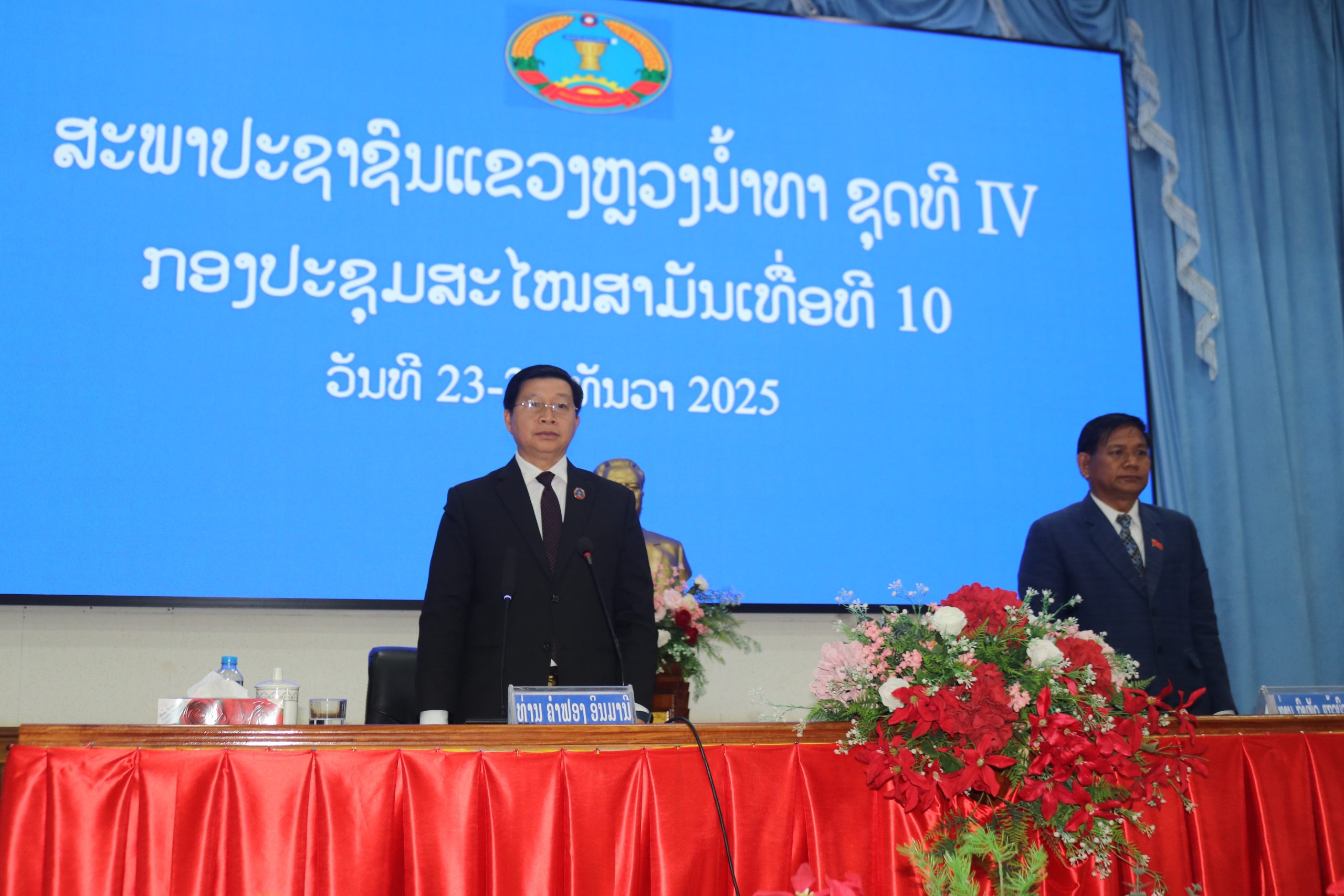 ກອງປະຊຸມສະໄໝສາມັນເທື່ອທີ 10 ຂອງສະພາປະຊາຊົນແຂວງຫຼວງນໍ້າທາ ຊຸດທີ IV ໄດ້ສຳເລັດລົງຢ່າງເປັນທາງການໃນຕອນເຊົ້າວັນທີ 25 ທັນວາ 2025 ຢູ່ທີ່ສະໂມສອນຂອງແຂວງ ພາຍໃຕ້ການເປັນປະທານຂອງທ່ານ ຄຳຟອງ ອິນມານີ ຮອງເລຂາພັກແຂວງ ປະທານສະພາປະຊາຊົນແຂວງຫຼວງນໍ້າທາ ໂດຍການໃຫ້ກຽດເຂົ້າຮ່ວມຂອງ ທ່ານ ວຽງສະຫວັດ ສີພັນດອນ ກໍາມະການສູນກາງພັກ, ເລຂາຄະນະບໍລິຫານງານພັກແຂວງ, ເຈົ້າແຂວງໆຫຼວງນໍ້າທາ,ມີການນໍາຂອງແຂວງ,ອະດີດການນໍາຂອງແຂວງ, ອະດີດສະມາຊິກສະພາແຫ່ງຊາດ ປະຈໍາເຂດເລືອກຕັ້ງ, ອະດີດສະມາຊິກສະພາປະຊາຊົນແຂວງ, ມີບັນດາທ່ານສະມາຊິກສະພາແຫ່ງຊາດ,ສະມາຊິກສະພາປະຊາຊົນແຂວງ, ການນໍາຂອງເມືອງ, ພະແນກການ,ອົງການລັດທຽບເທົ່າພະແນກຂັ້ນແຂວງ , ສອງກອງບັນຊາການຂອງແຂວງ, ອົງການແນວລາວສ້າງຊາດ, ສະຫະພັນນັກຮົບເກົ່າ, ອົງການຈັດຕັ້ງມະຫາຊົນ,ອົງການກວດສອບປະຈໍາພາກເໜືອ-2ແລະ ແຂກຖືກເຊີນ ເຂົ້້າຮ່ວມທັງໝົດ 180 ກວ່າທ່ານ.