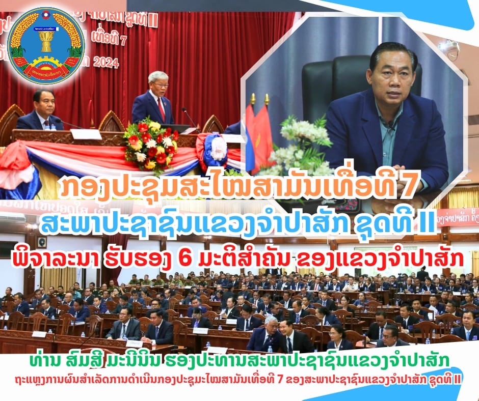 ໃນວັນທີ 1 ສິງຫາ 2024 ທີ່ຜ່ານມາ ຢູ່ທີ່ສະພາປະຊາຊົນແຂວງຈໍາປາສັກ ທ່ານ ສົມສີ ມະນີນິນ ກໍາມະການພັກແຂວງ, ຮອງປະທານຄະນະປະຈໍາສະພາປະຊາຊົນແຂວງຈໍາປາສັກ ໄດ້ໃຫ້ຖະແຫຼງການຕໍ່ສື່ມວນຊົນ ກ່ຽວກັບຜົນສໍາເລັດຂອງການດໍາເນີນກອງປະຊຸມສະໄໝສາມັນເທື່ອທີ 7 ຂອງສະພາປະຊາຊົນແຂວງຈໍາປາສັກ ຊຸດທີ II ເຊິ່ງທ່ານໄດ້ໃຫ້ຮຸ້ວ່າ: ໃນນາມຄະນະປະຈໍາສະພາປະຊາຊົນແຂວງ, ມີຄວາມຍິນດີ ແລະ ຖືເປັນກຽດ ແຈ້ງມາຍັງບັນດາທ່ານ ພະນັກງານ, ທະຫານ, ຕຳຫຼວດ, ນັກຮຽນ, ນັກສຶກສາ, ປັນຍາຊົນ, ກຳມະກອນ, ຊາວຜູ້ອອກແຮງງານ, ພໍ່ແມ່ພີ່ນ້ອງປະຊາຊົນຊາວແຂວງຈໍາປາສັກ ຮັບຊາບກ່ຽວກັບຜົນສໍາເລັດຂອງການດໍາເນີນກອງປະຊຸມສະໄໝສາມັນເທື່ອທີ 5 ຂອງສະພາປະຊາຊົນແຂວງຈໍາປາສັກ ຊຸດທີ II ດັ່ງນີ້:
