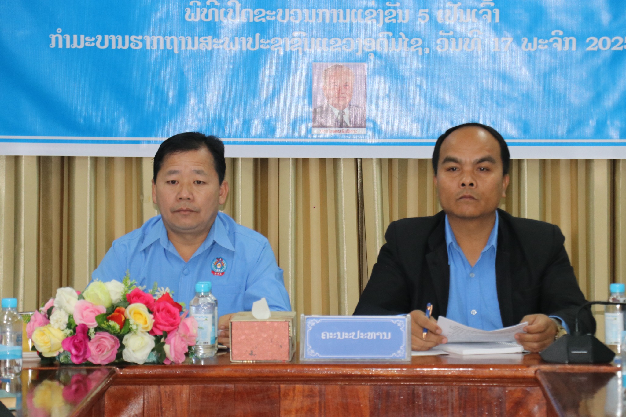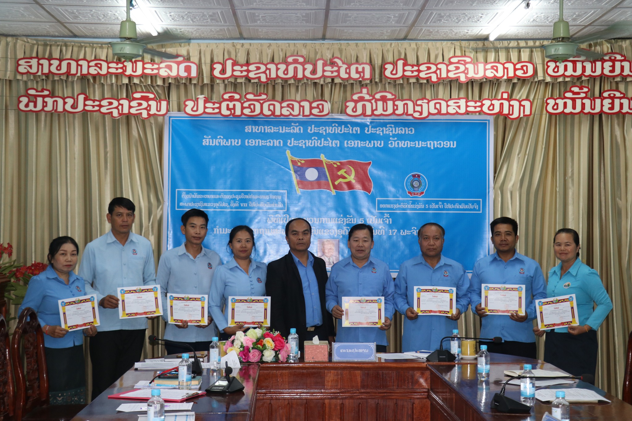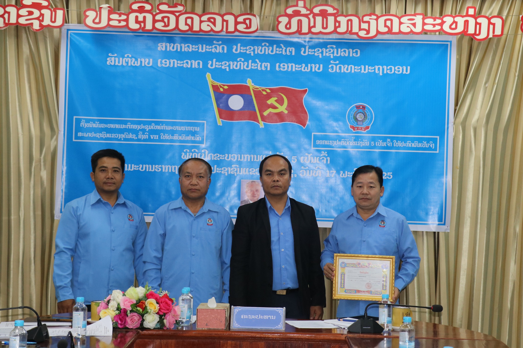 ຫຼັງຈາກນັ້ນ, ໄດ້ຜ່ານຂໍ້ຕົກລົງ ຂອງສະຫະພັນກໍາມະບານແຂວງ ວ່າດ້ວຍການຍ້ອງຍໍສະມາຊິກດີເດັ່ນ 2 ປີຊ້ອນ(2023-2024); ຜ່ານຂໍ້ຕົກລົງ ຂອງປະທານກຳມະບານຮາກຖານສະພາປະຊາຊົນແຂວງ ວ່າດ້ວຍການຊົມເຊີຍສະມາຊິກ ແລະ ຜ່ານຂໍ້ຕົກລົງ ຂອງສະຫະພັນກໍາມະບານແຂວງ ວ່າດ້ວຍການມອບໃບຢັ້ງຢືນ 5 ເປັນເຈົ້າ ປະຈຳປີ 2025 ໃຫ້ກຳມະບານຮາກຖານສະພາປະຊາຊົນແຂວງ ແລະ ໄດ້ ມອບ-ຮັບ ຢ່າງເປັນທາງການ, ພ້ອມທັງຈັບມືຮ່ວມກັນສືບຕໍ່ຈັດຕັ້ງປະຕິບັດຂໍ້ແຂ່ງຂັນ 5 ເປັນເຈົ້າ ໃນປີ 2026.