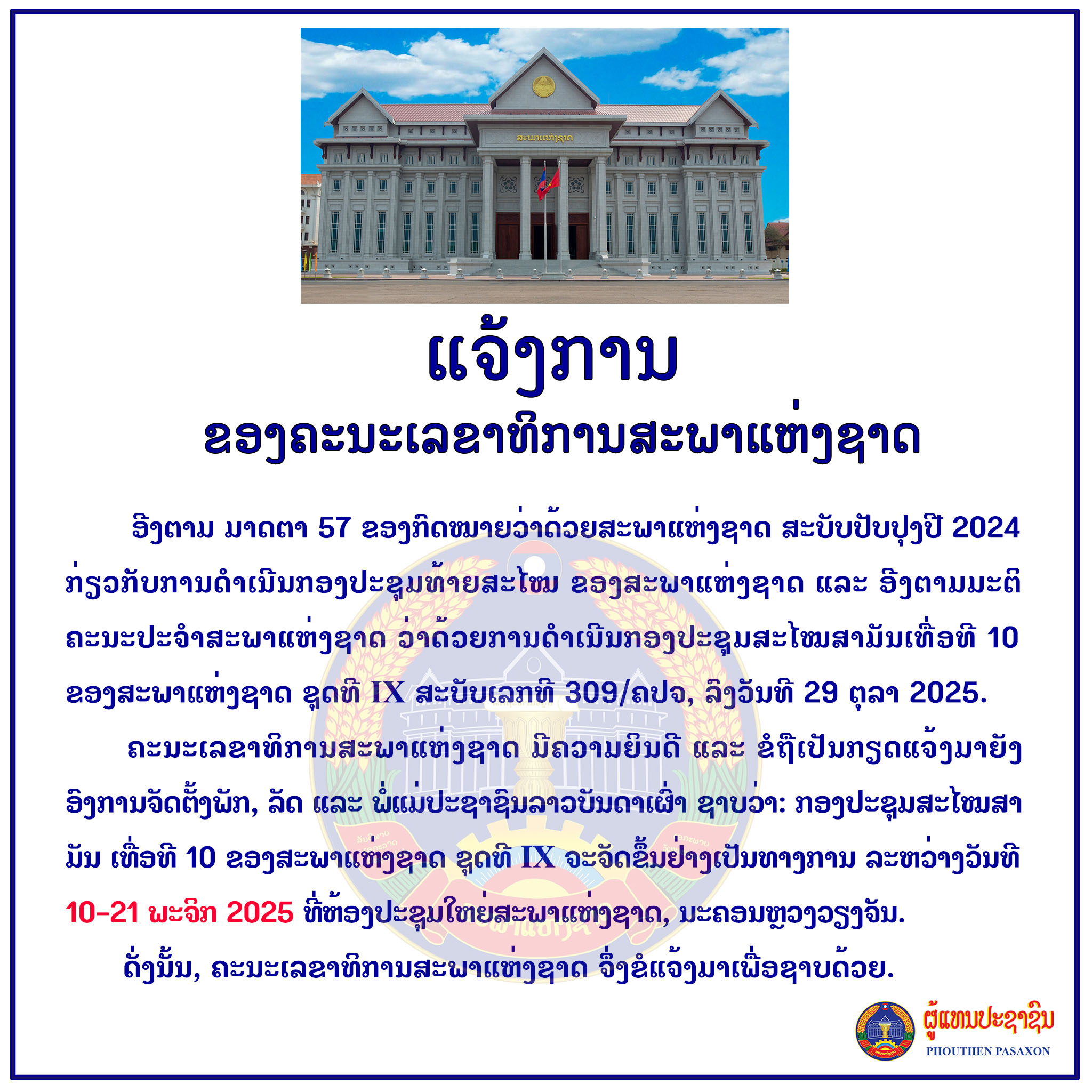 ແຈ້ງການ ຂອງຄະນະເລຂາທິການສະພາແຫ່ງຊາດ ກ່ຽວກັບການດຳເນີນກອງປະຊຸມສະໄໝສາມັນ ເທື່ອທີ 10 ຂອງສະພາແຫ່ງຊາດ ຊຸດທີ IX.